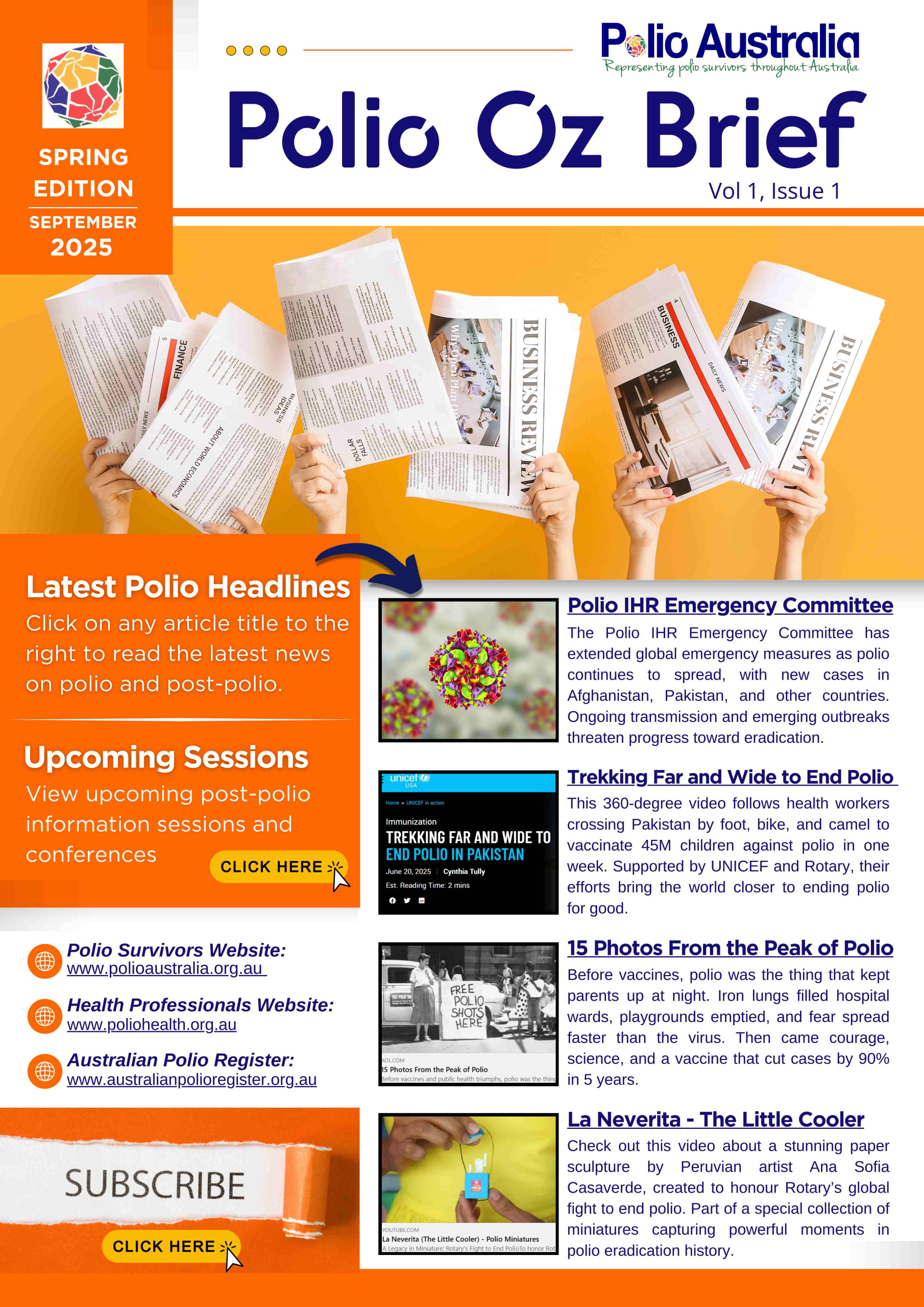Our Polio Oz Newsletter is published each March, June, September and December and distributed widely via electronic means throughout Australia and many countries overseas. Our Polio Oz Newsletter chronicles information obtained from an extensive range of Australian and international sources, including the latest in post-polio research, articles from health professionals, polio stories, reports of Polio Australia’s activities, government initiatives, current affairs, and more.